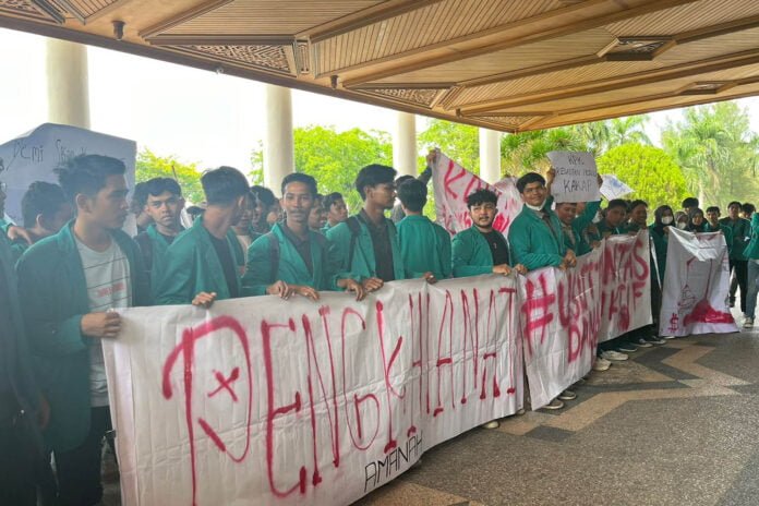 “Bohong kalau beliau tidak tahu-menahu soal ini. Karena dalam Dokumen Pelaksanaan Anggaran (DPA) alokasi perkara BRA ini ada di masa Bustami menjabat sebagai sekda,” teriak orator aksi, Linda dihadapan Yusrizal dan disaksikan ratusan mahasiswa dan tim pengaman.