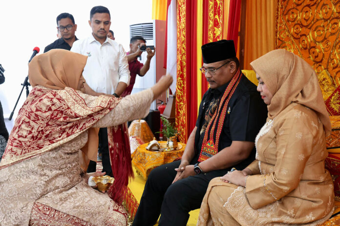 HABAKITA – Pj Gubernur Aceh, Safrizal ZA, disambut dengan peusijuek saat tiba di Bandara Internasional Sultan Iskandar Muda, Blang Bintang, Aceh Besar, pada Sabtu, 23 Agustus 2024 sore.